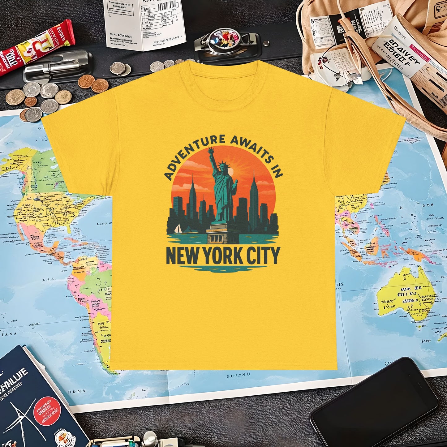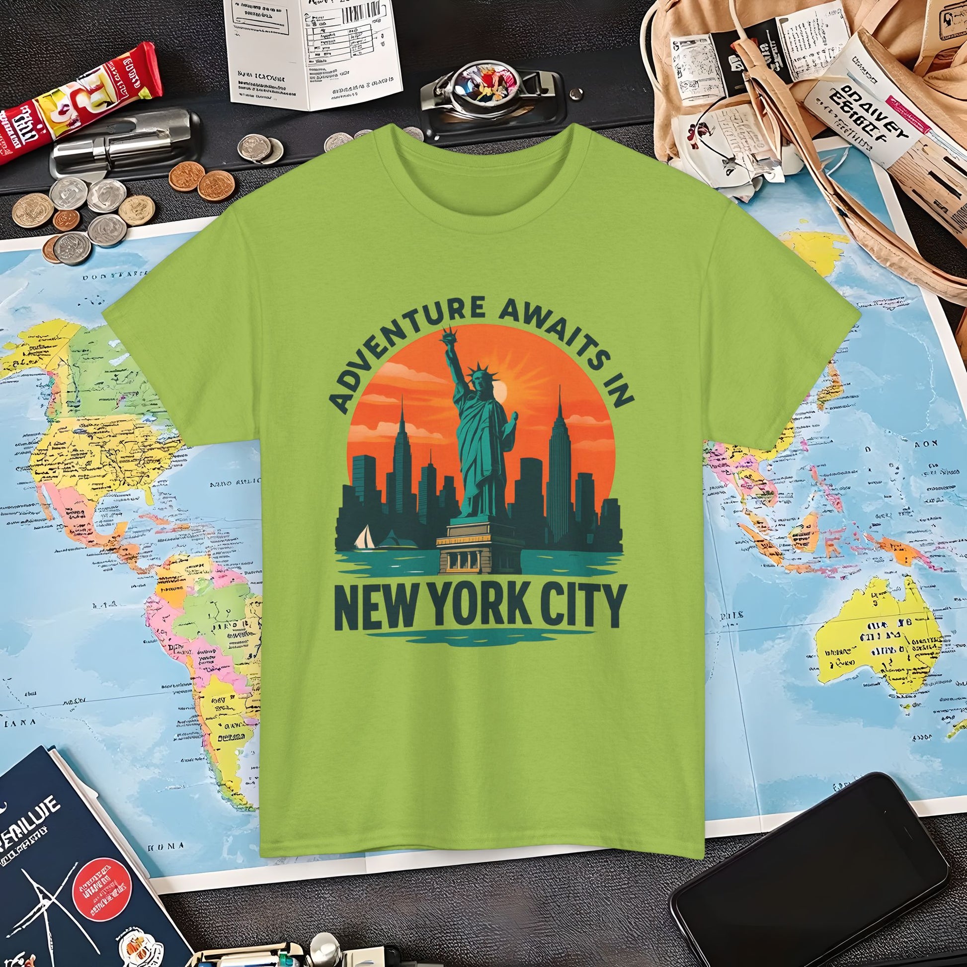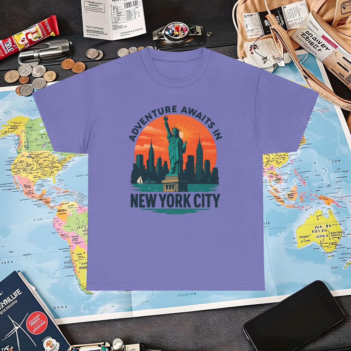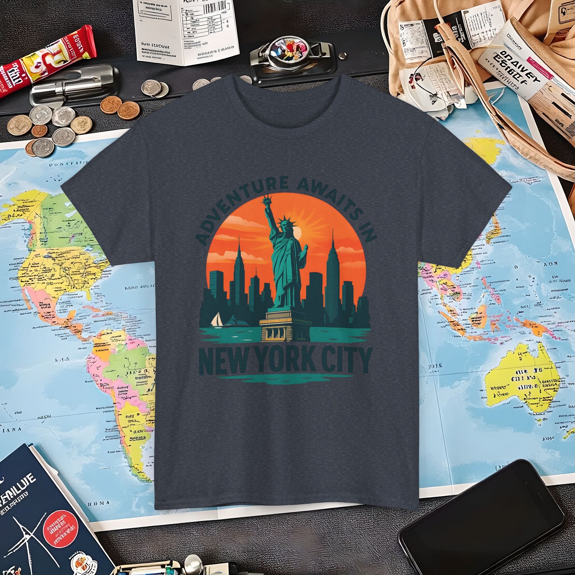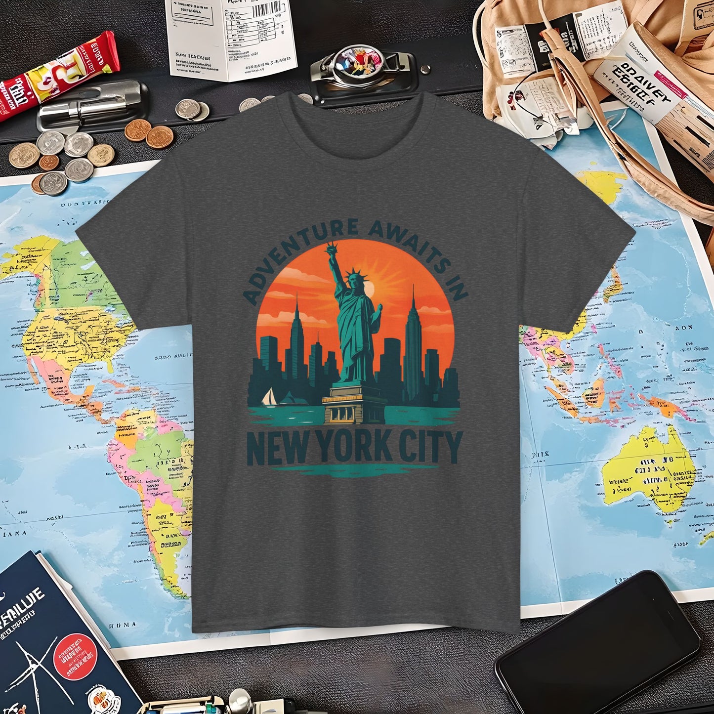 Adventure Awaits in New York City T-Shirt – Sunset Skyline with Statue of Liberty Design Air Travel T-Shirts | Jetsetter, Airport, and International Flight Tees