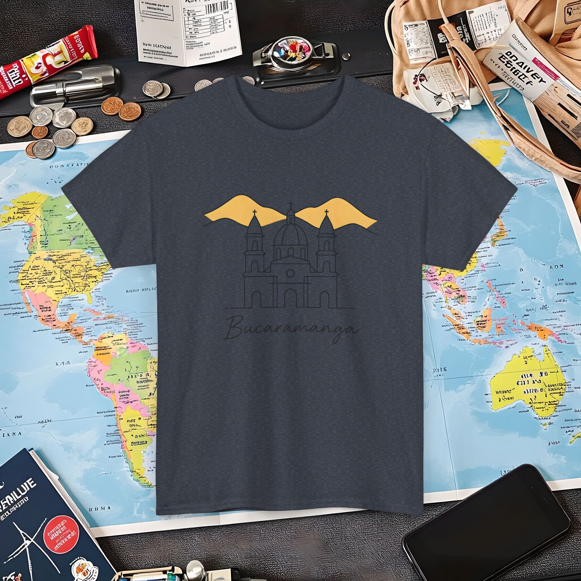 Bucaramanga Cathedral with Andes Silhouette – Vintage Colombia Travel Tee | Layover Club Air Travel T-Shirts | Jetsetter, Airport, and International Flight Tees