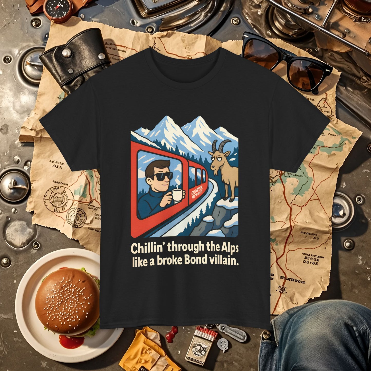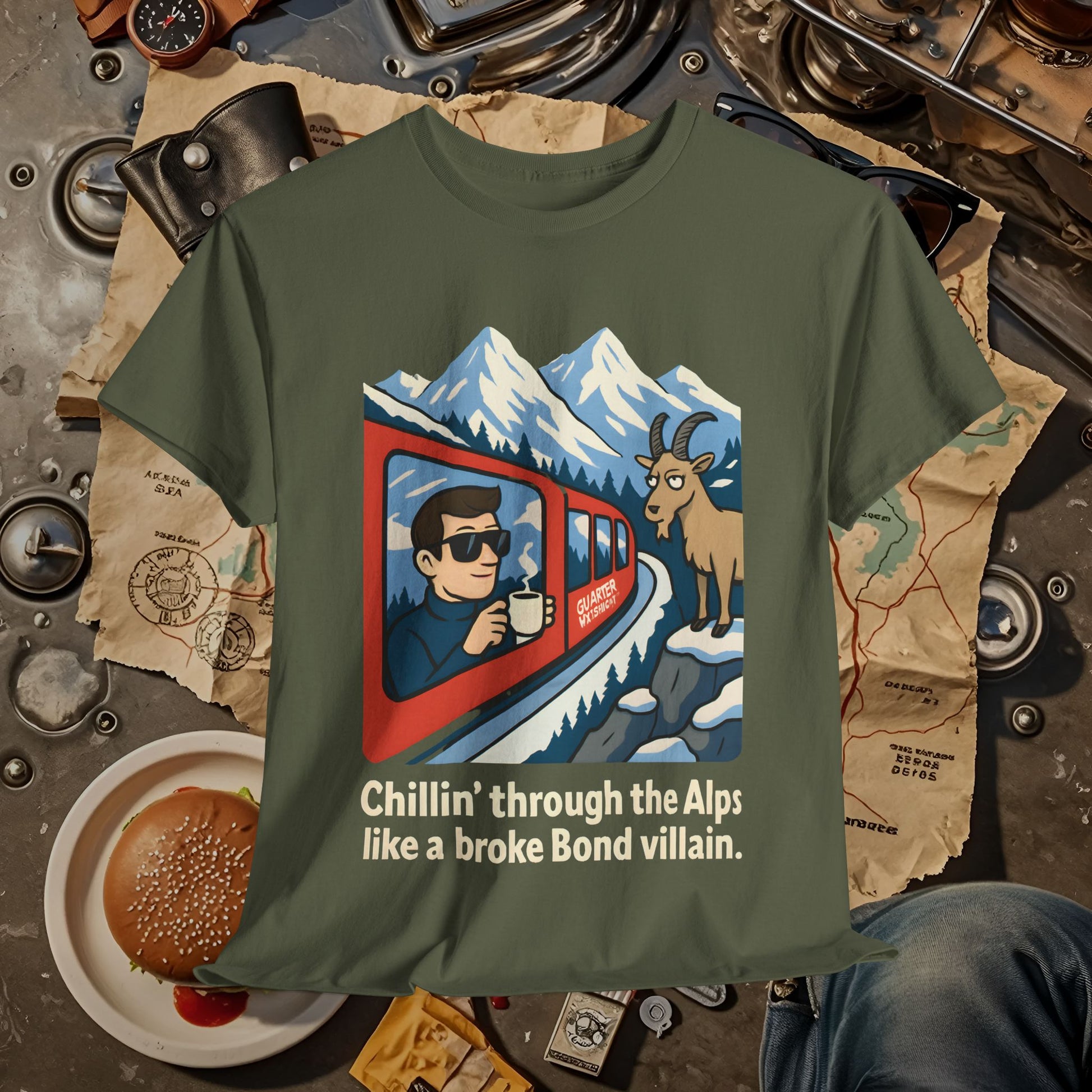 Glacier Express Chill Tee – Skeptical Goat in the Alps Vibe Road Trip & Vehicle Travel T-Shirts | Car, RV, and Motorcycle Adventure Tees