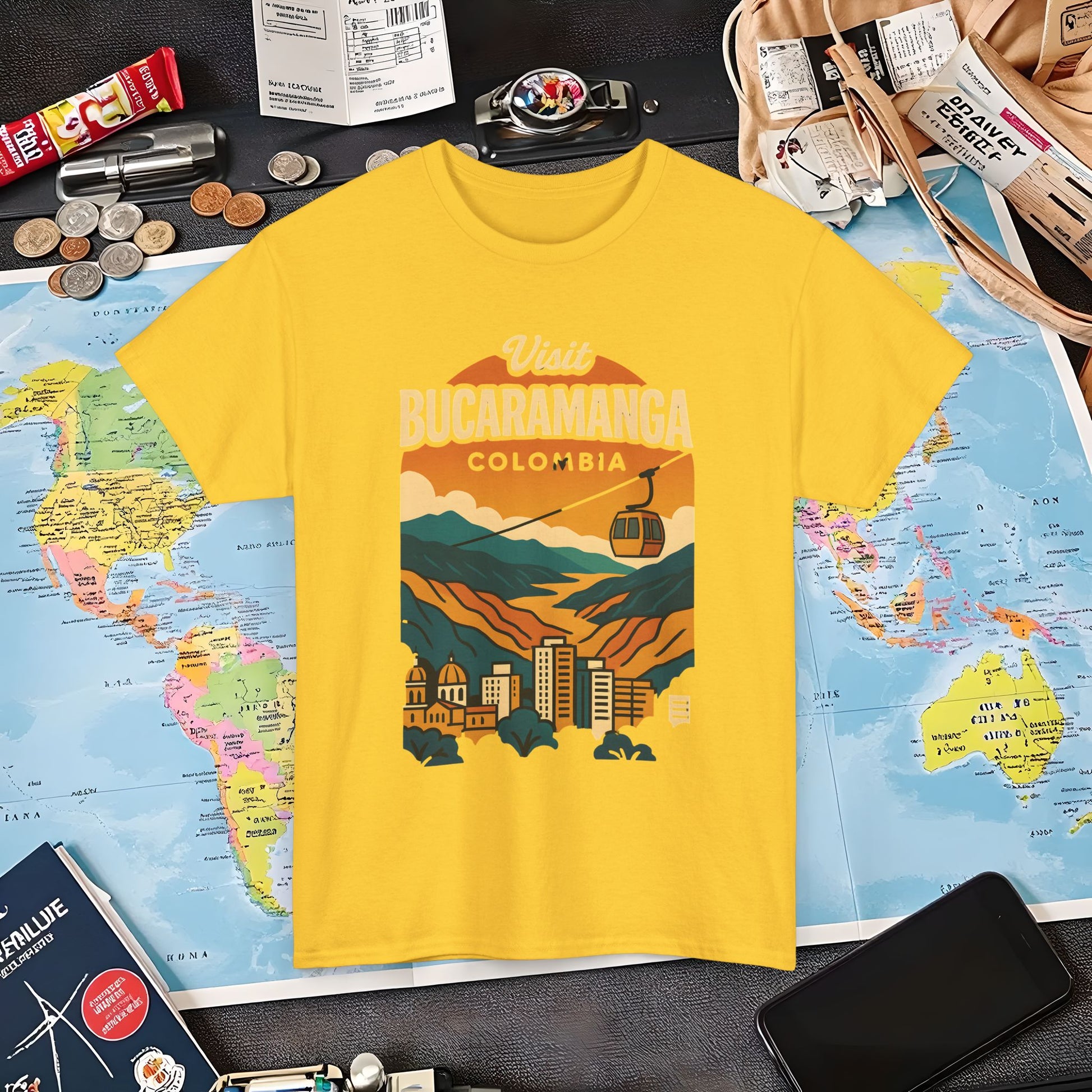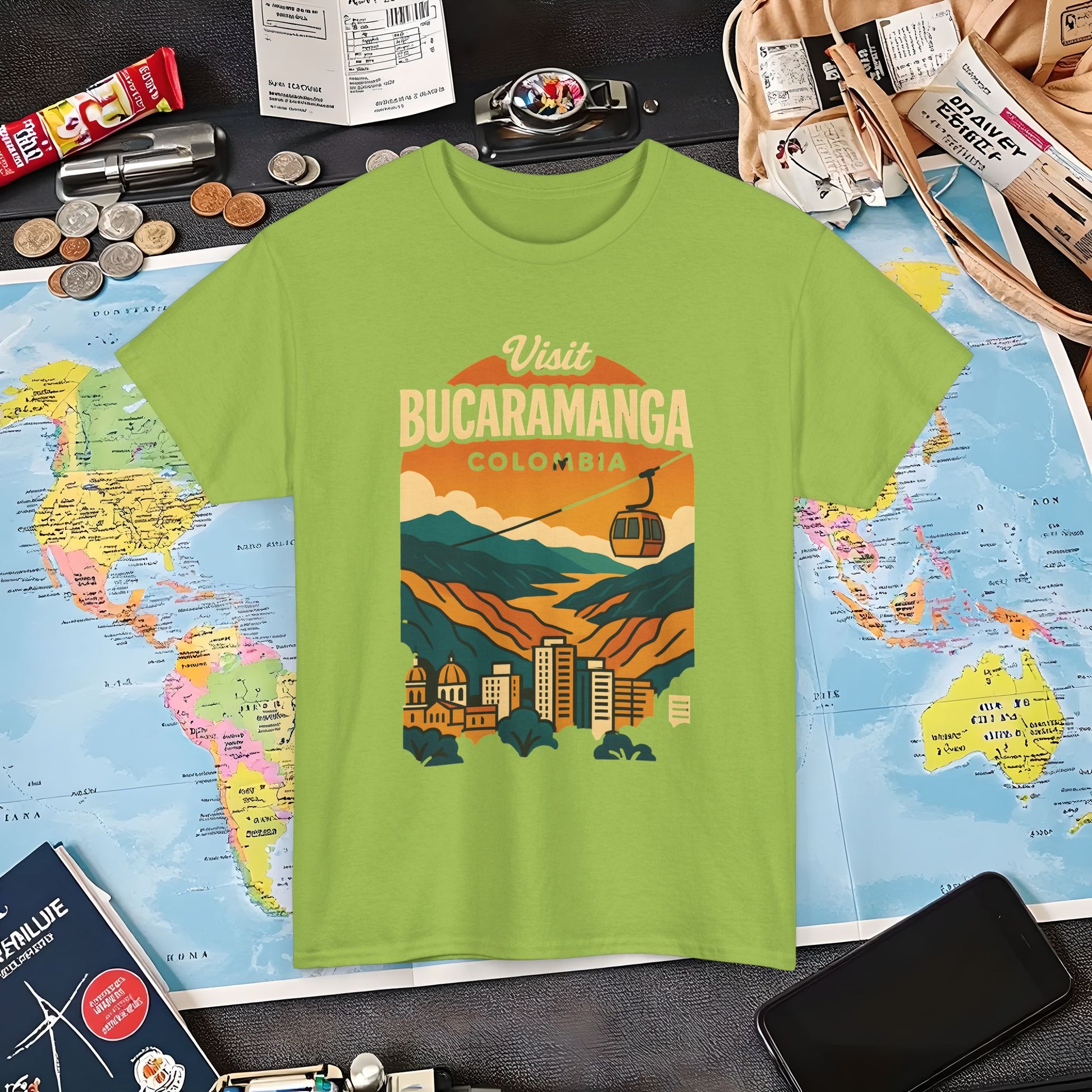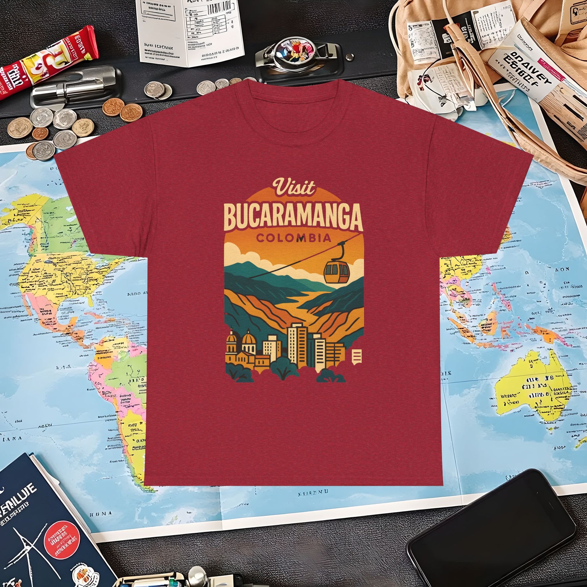 Retro Bucaramanga Skyline with Chicamocha Canyon – Vintage Colombia Travel Tee | Layover Club Air Travel T-Shirts | Jetsetter, Airport, and International Flight Tees