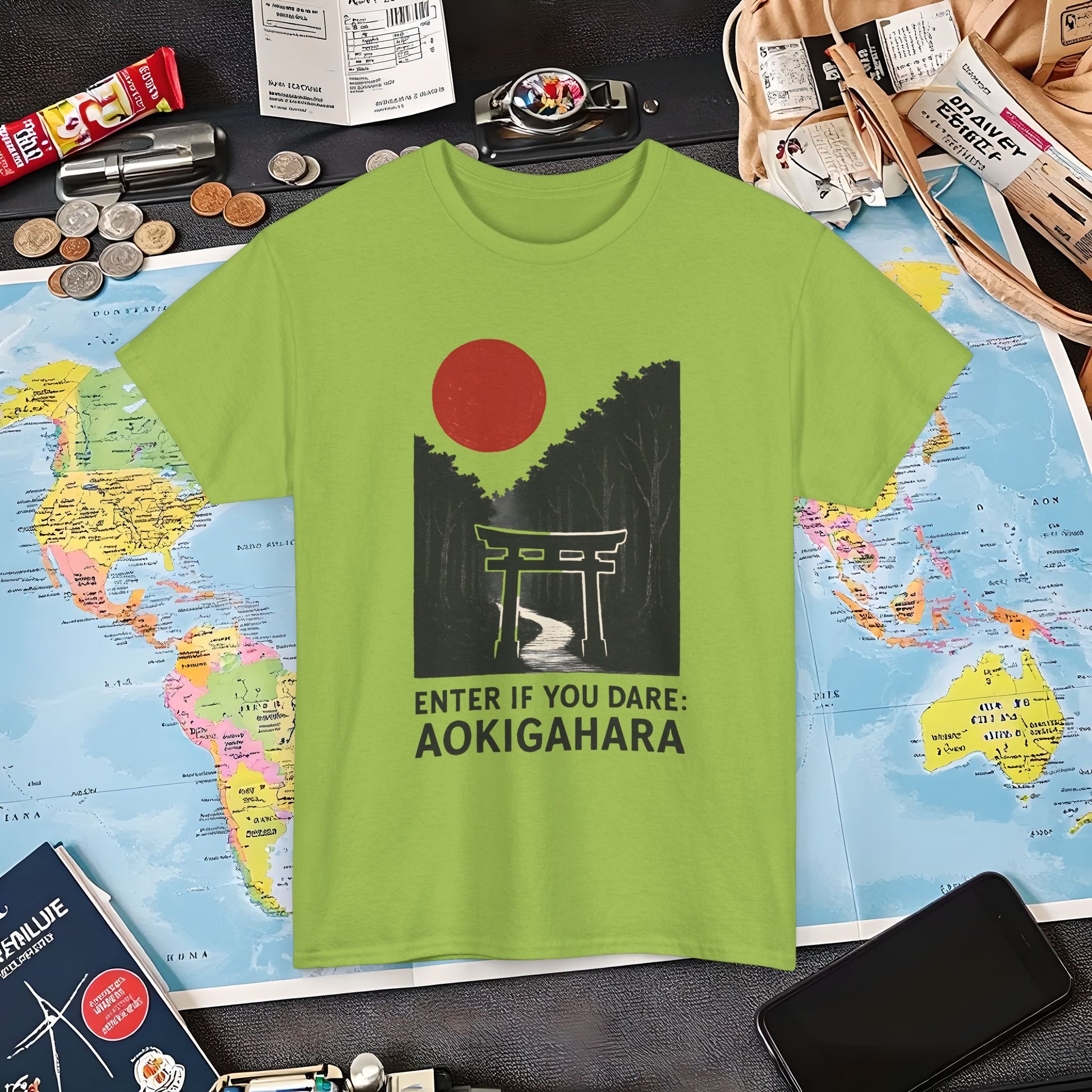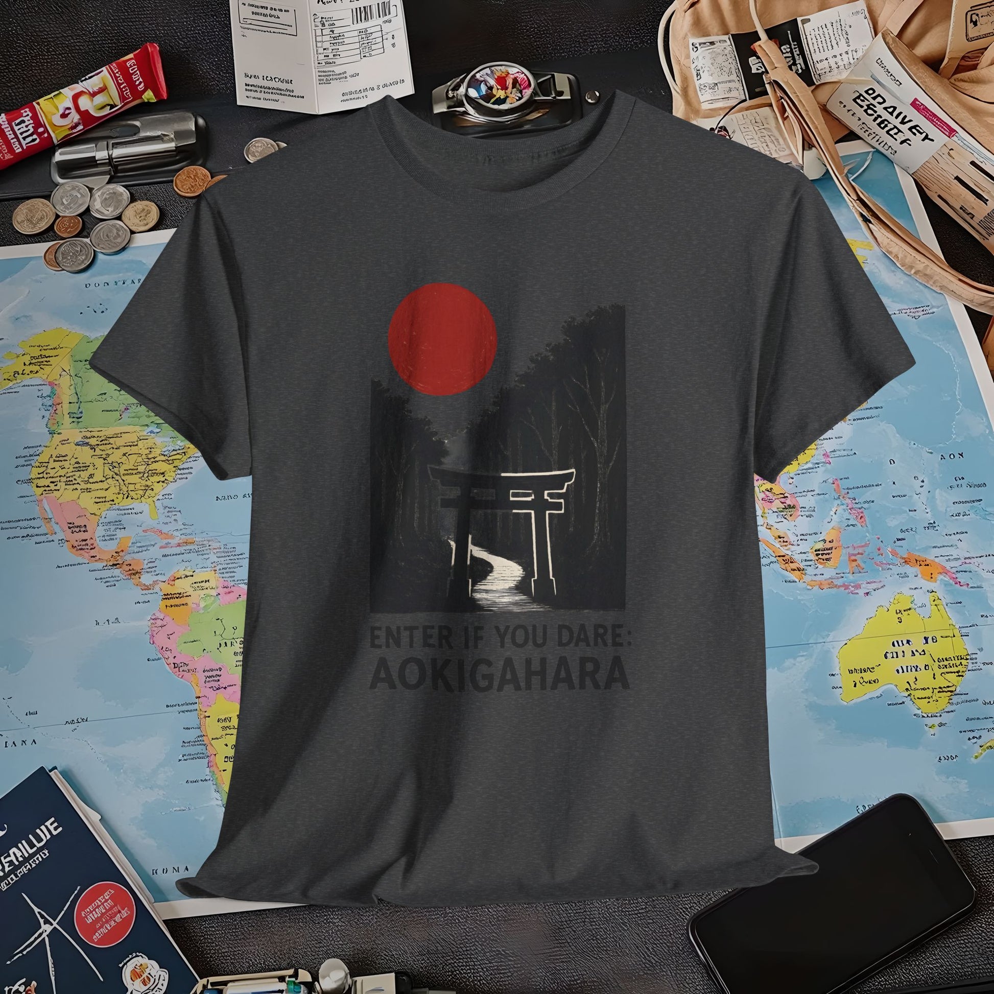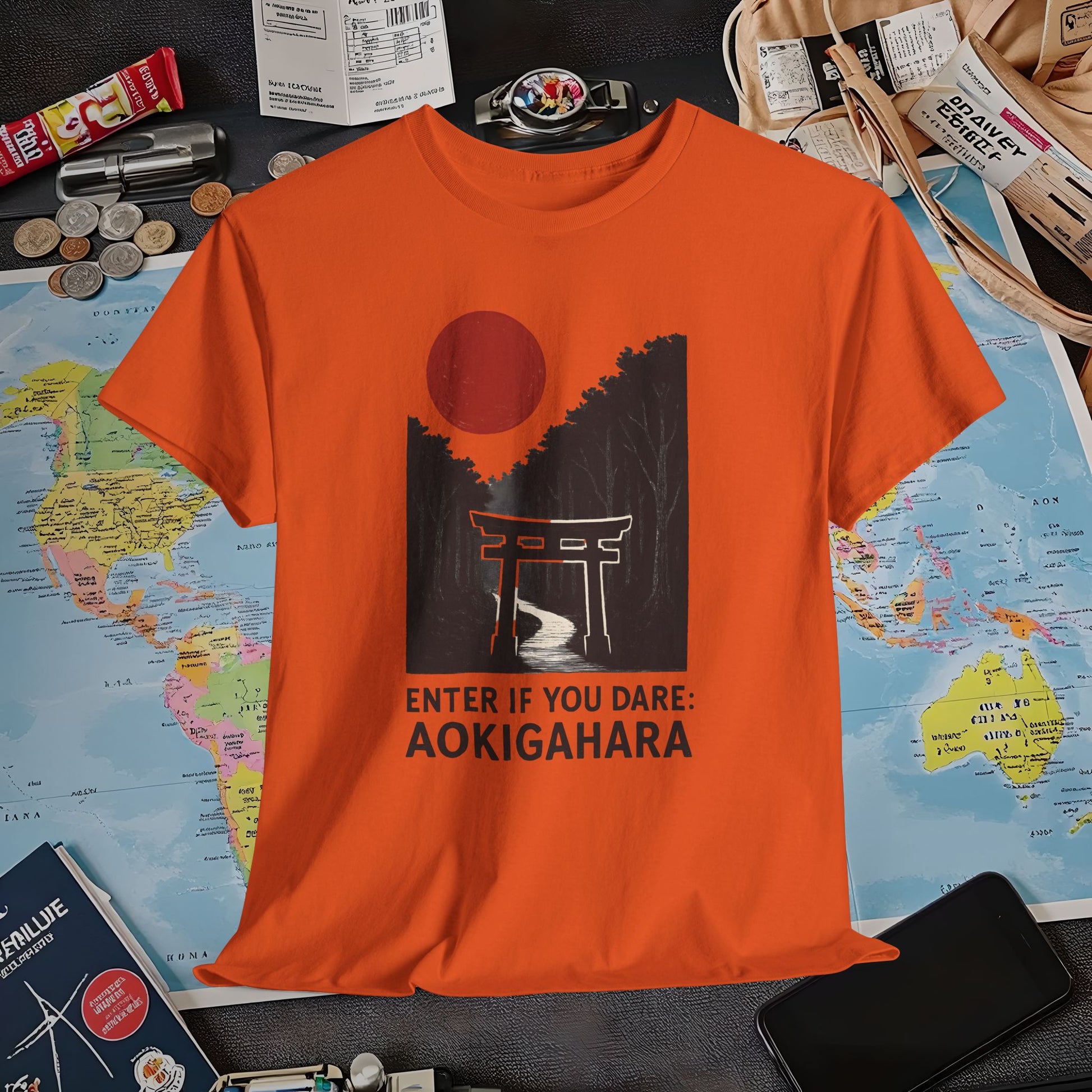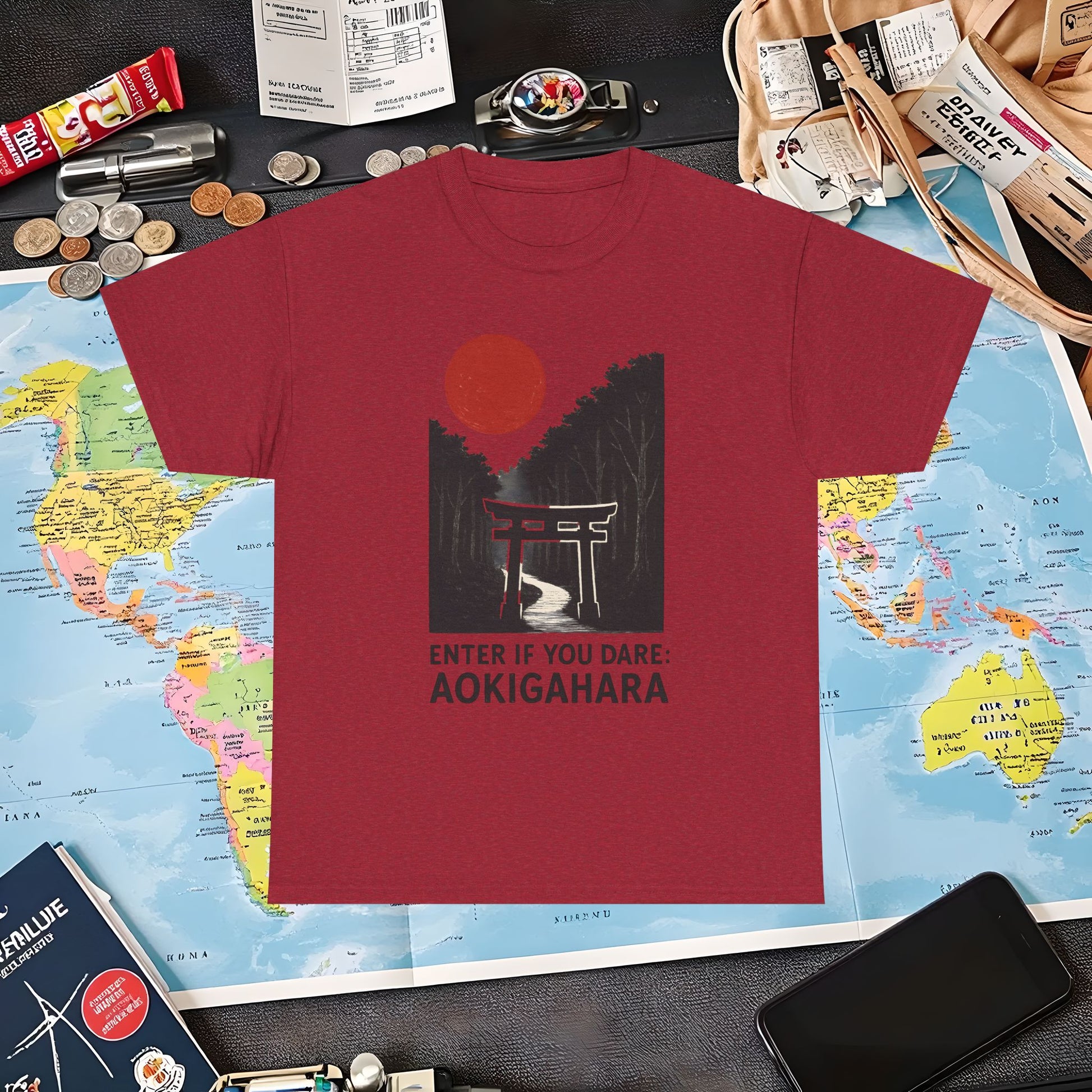 Scarlet Moon Torii – Aokigahara Forest Path Tee – Haunted Japan Travel Shirt | Layover Club Air Travel T-Shirts | Jetsetter, Airport, and International Flight Tees