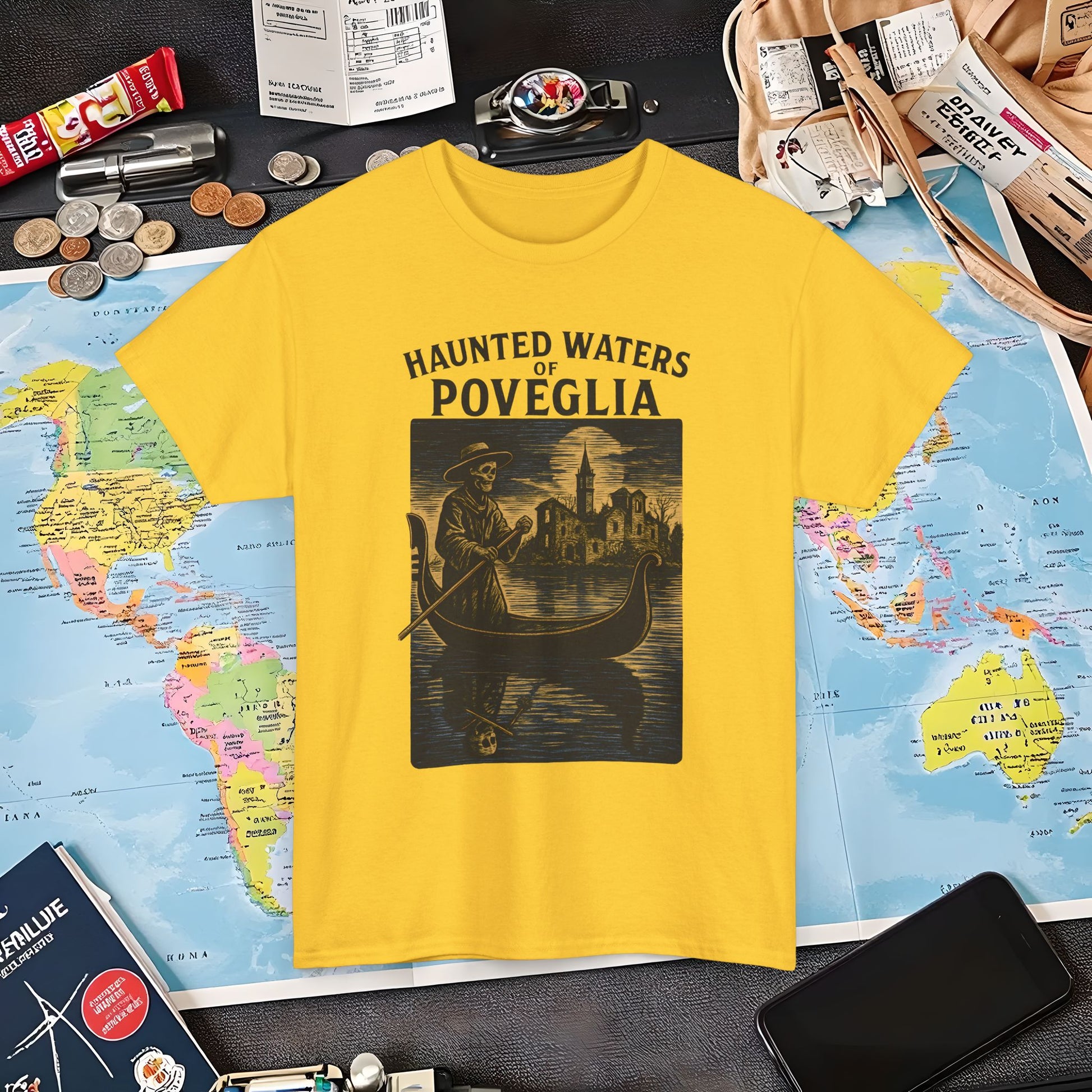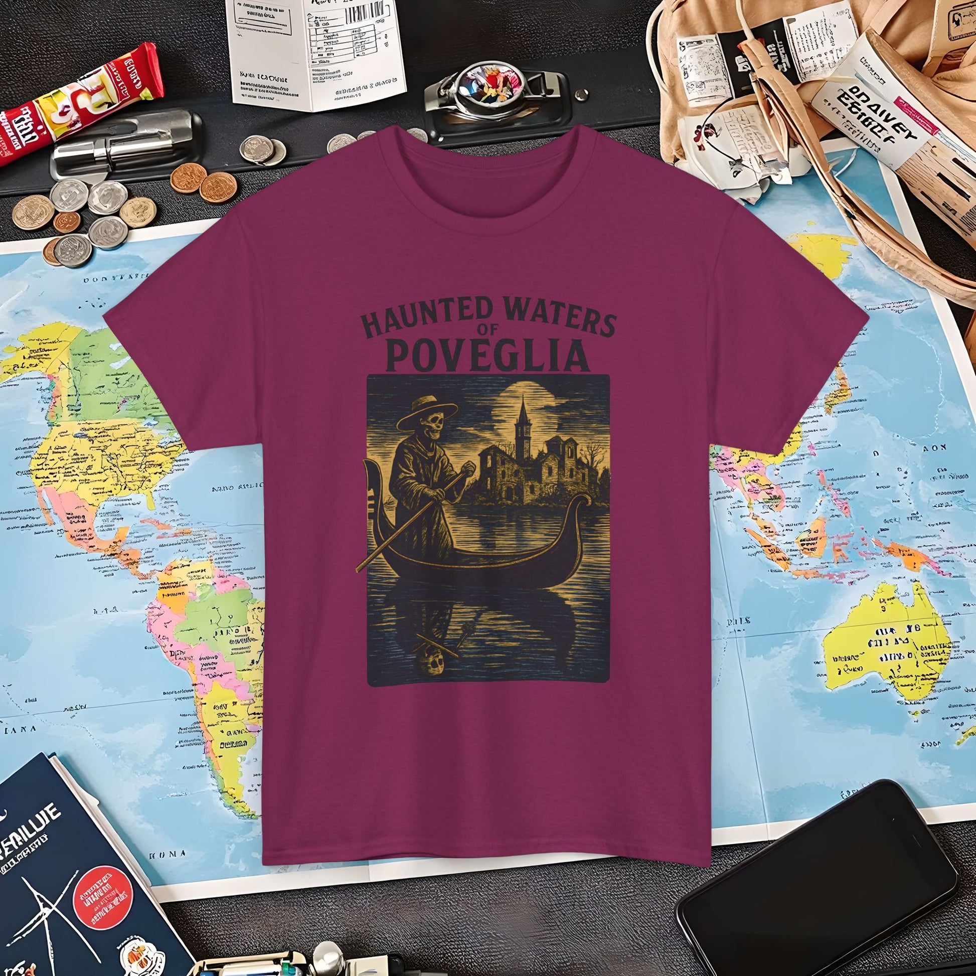 Skeletal Gondolier of Haunted Poveglia – Dark Venetian Ghost Travel Tee| Layover Club Air Travel T-Shirts | Jetsetter, Airport, and International Flight Tees