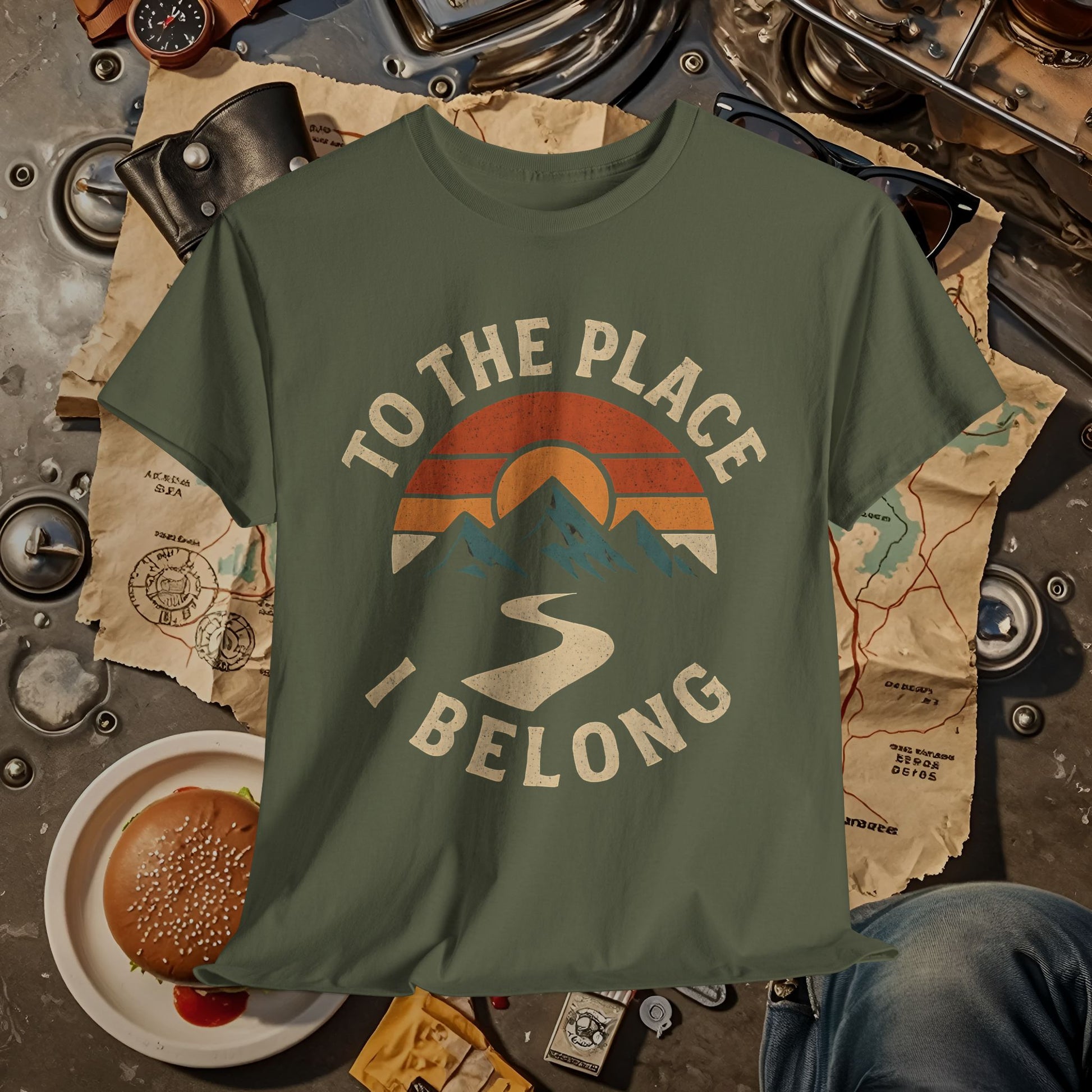 To the Place I Belong T-Shirt – Retro Sunset Mountain Road Travel Badge Road Trip & Vehicle Travel T-Shirts | Car, RV, and Motorcycle Adventure Tees