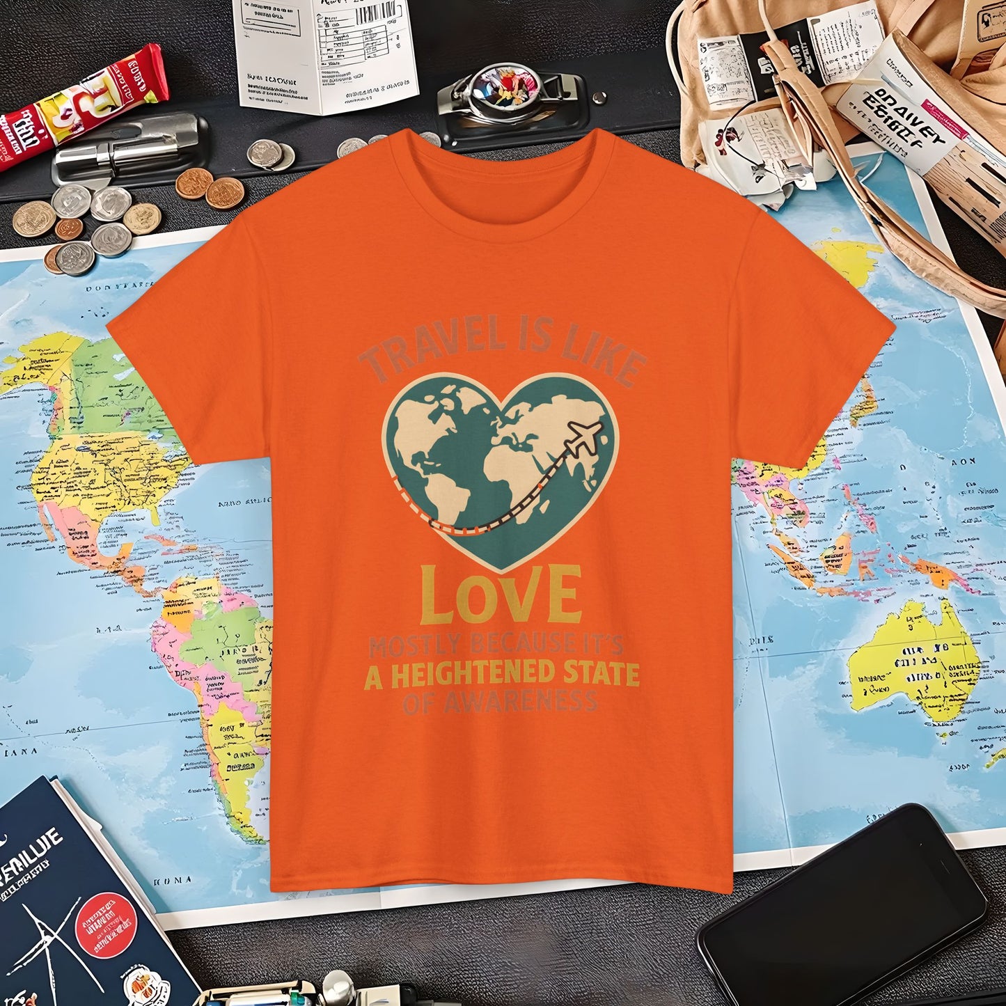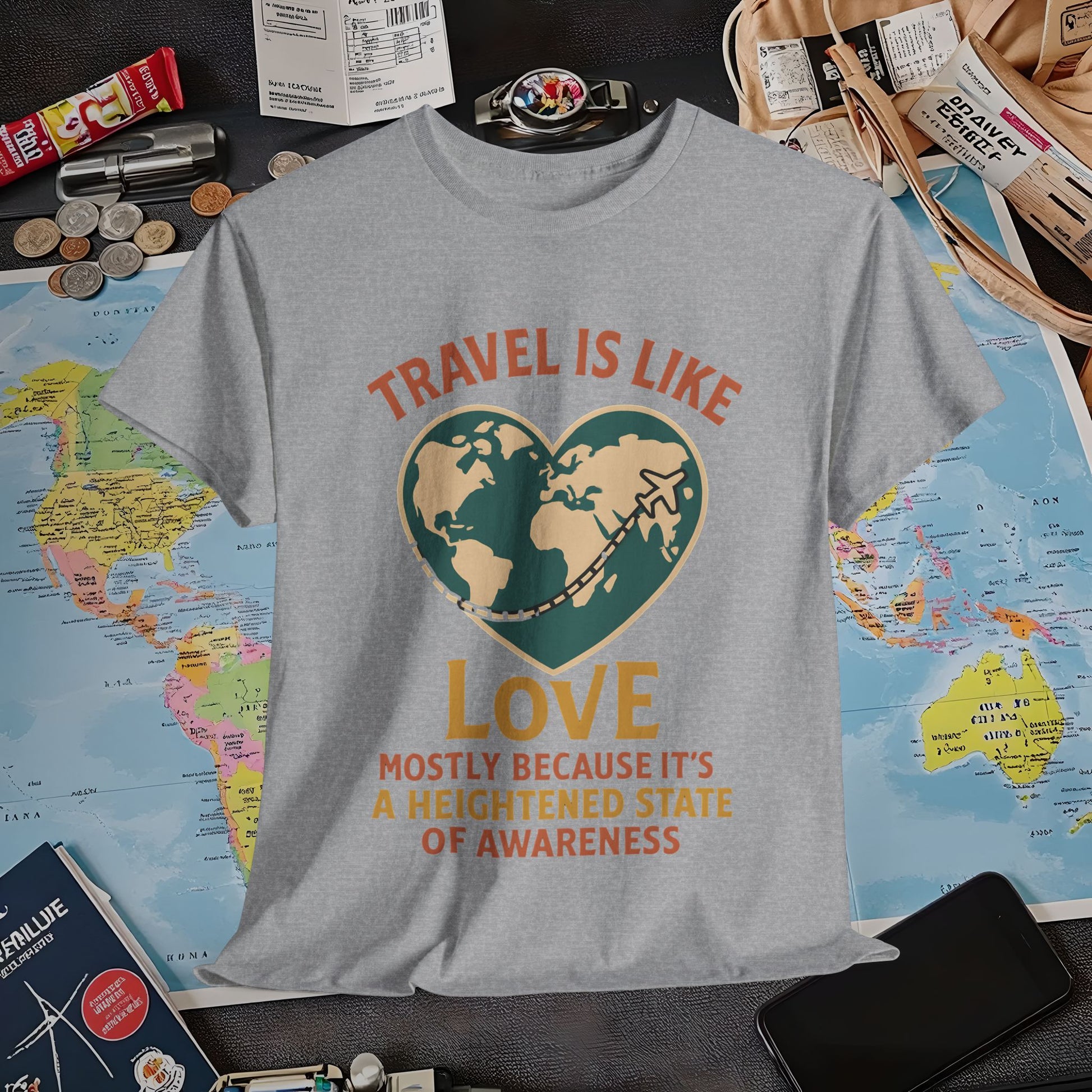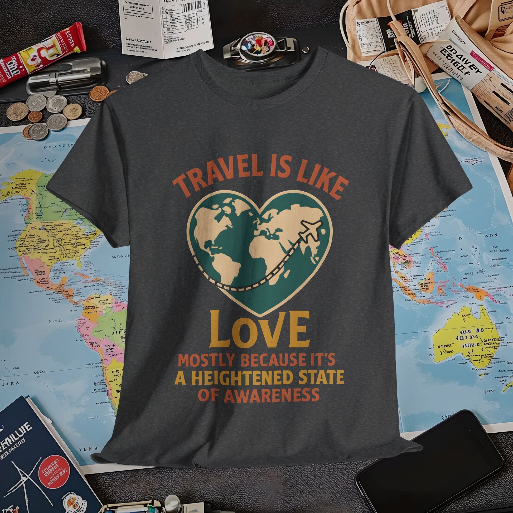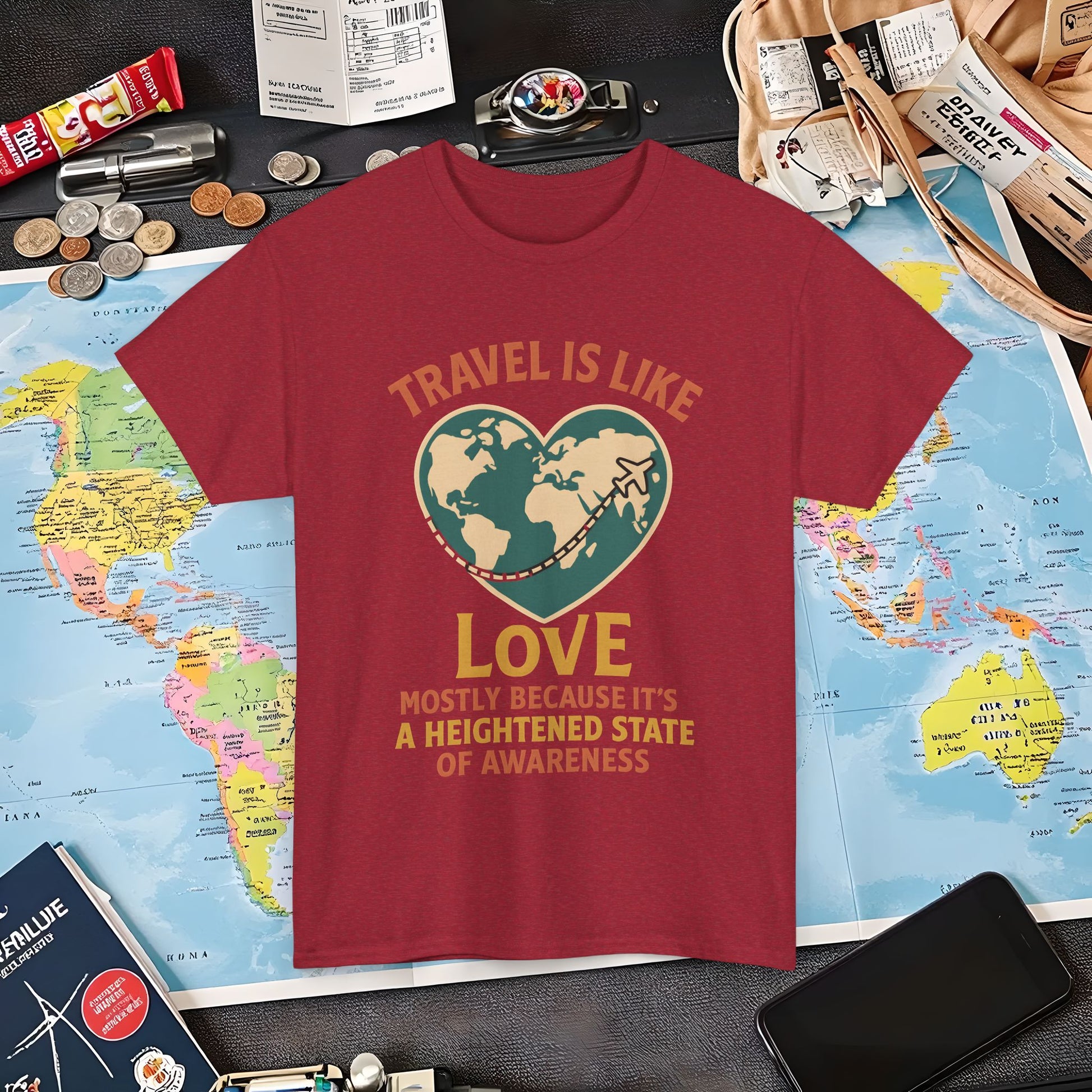 Travel Is Like Love – Heart Map Quote Tee with Airplane Path | Layover Club Air Travel T-Shirts | Jetsetter, Airport, and International Flight Tees