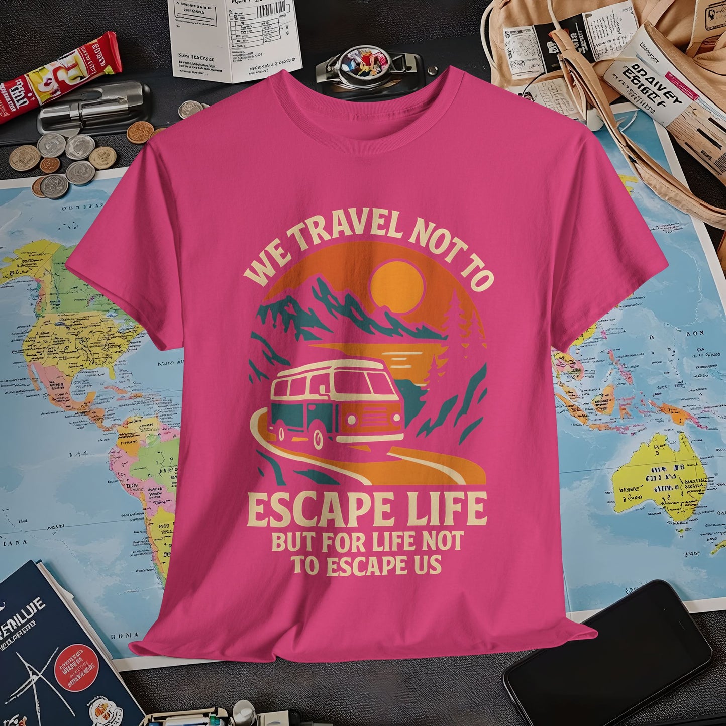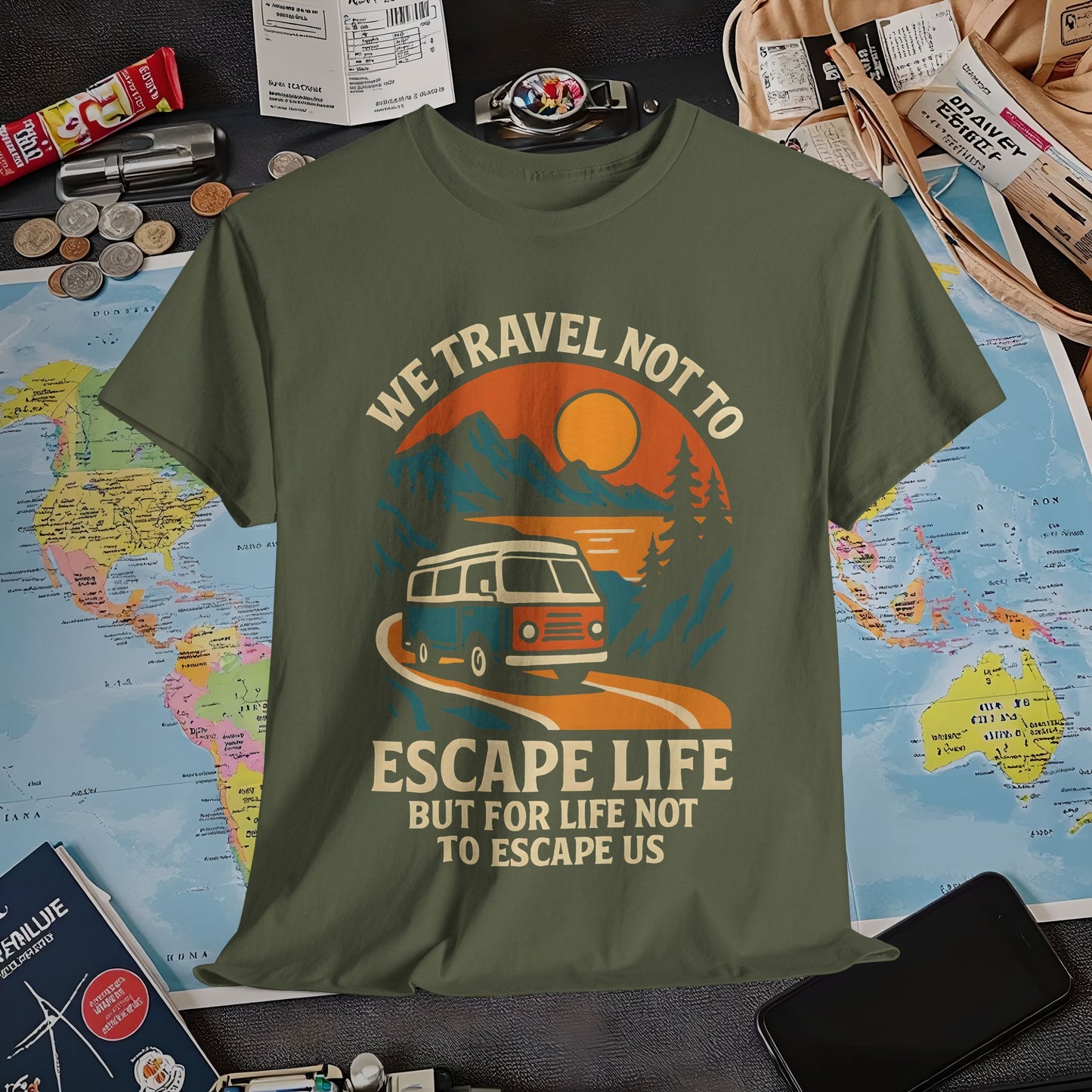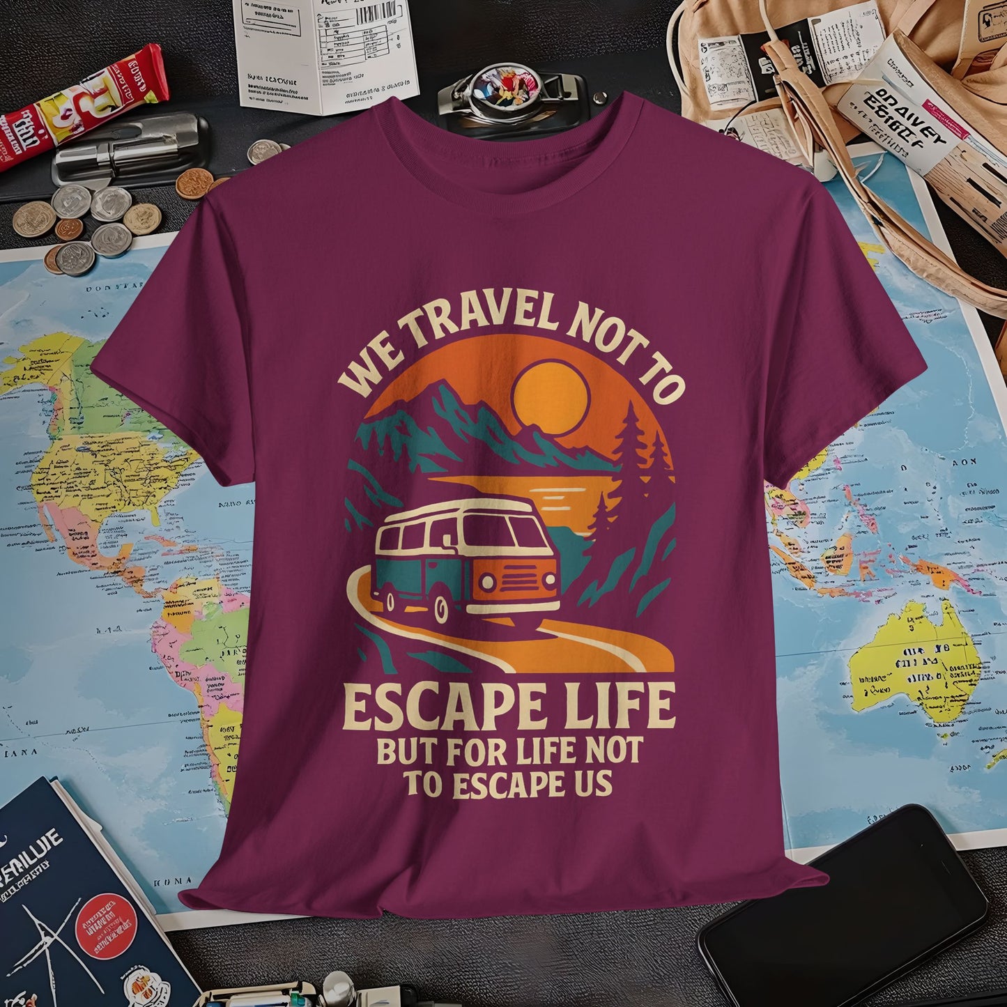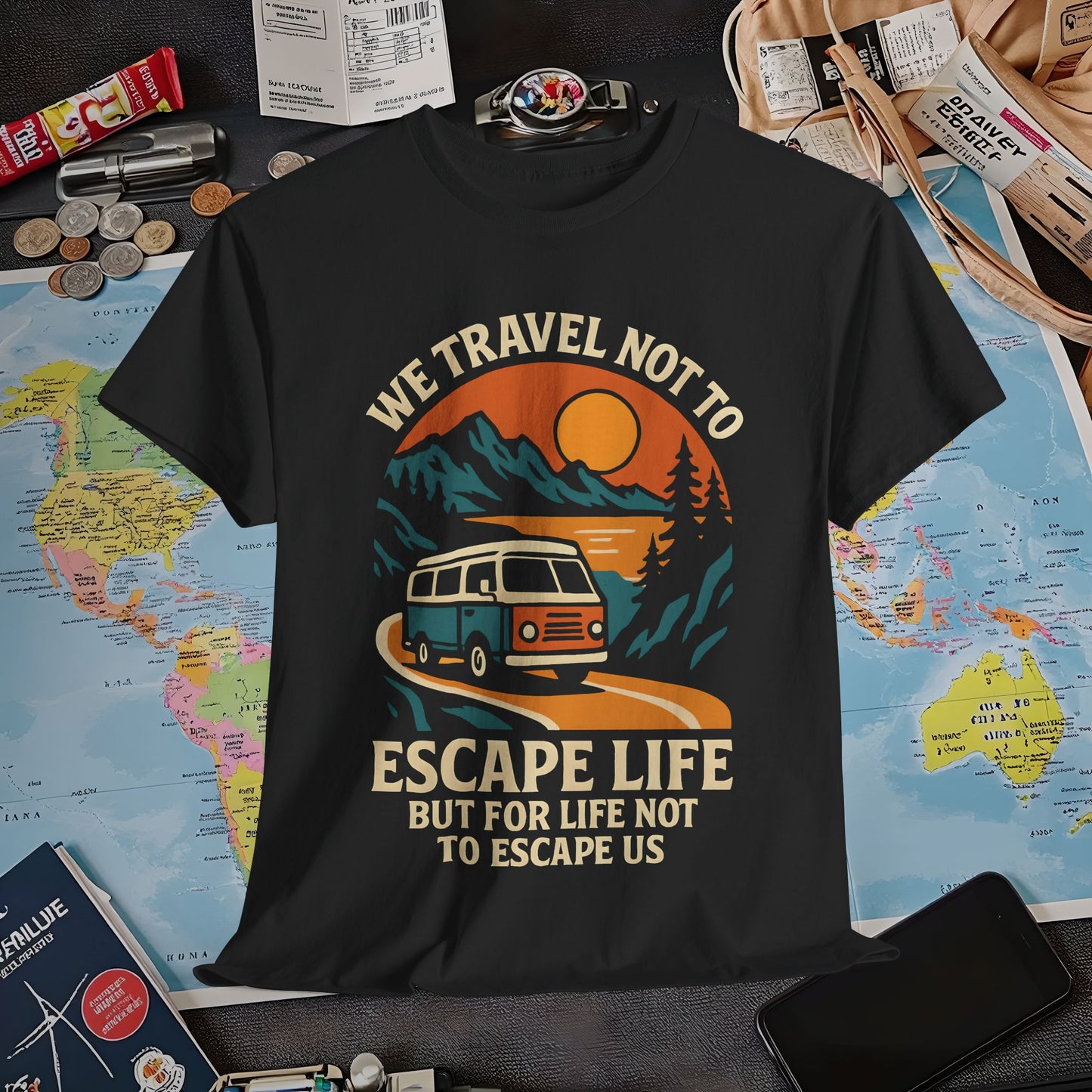 Travel Not to Escape Life – Retro Van & Sunset Road Adventure Tee | Layover Club Air Travel T-Shirts | Jetsetter, Airport, and International Flight Tees