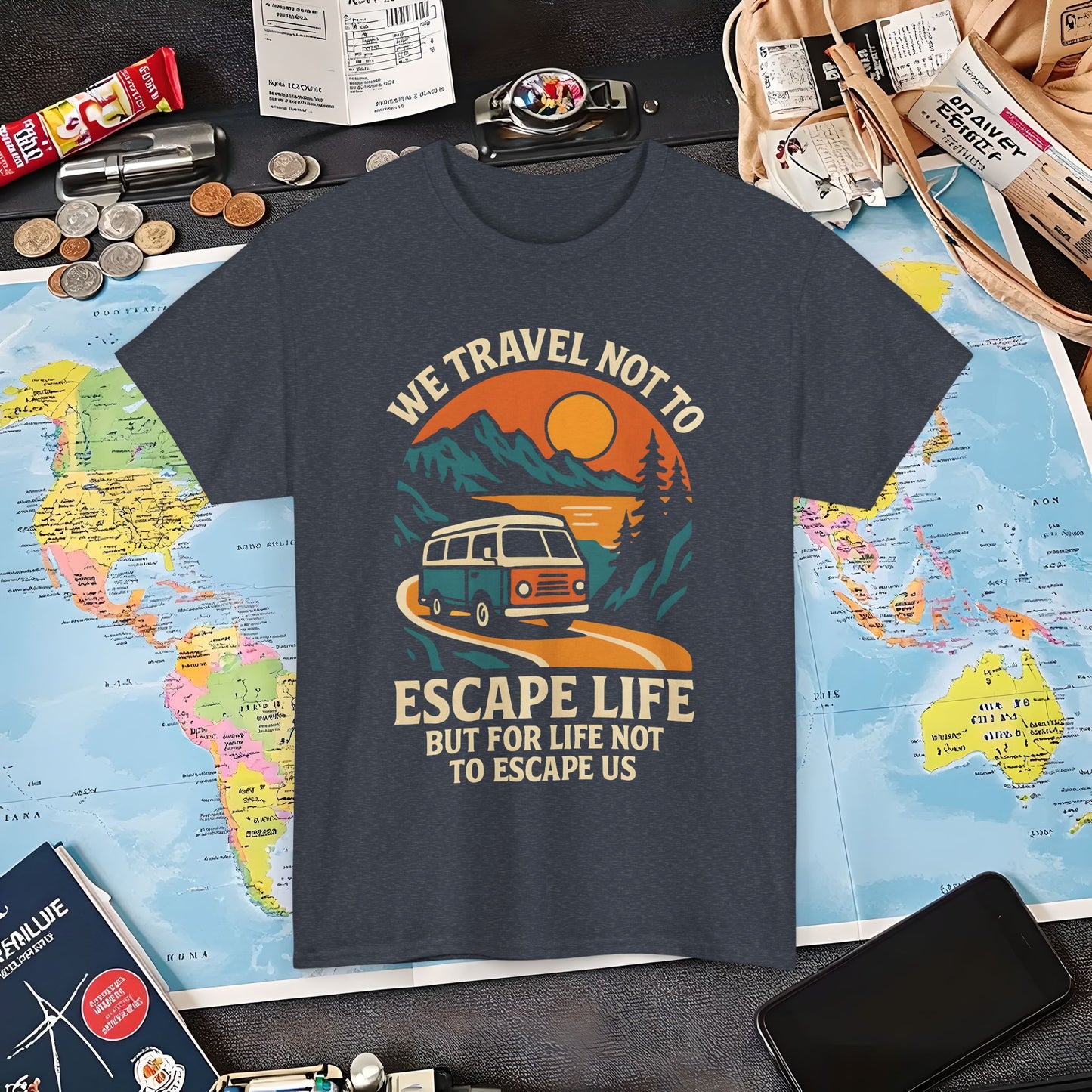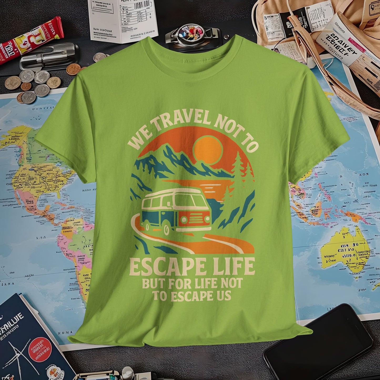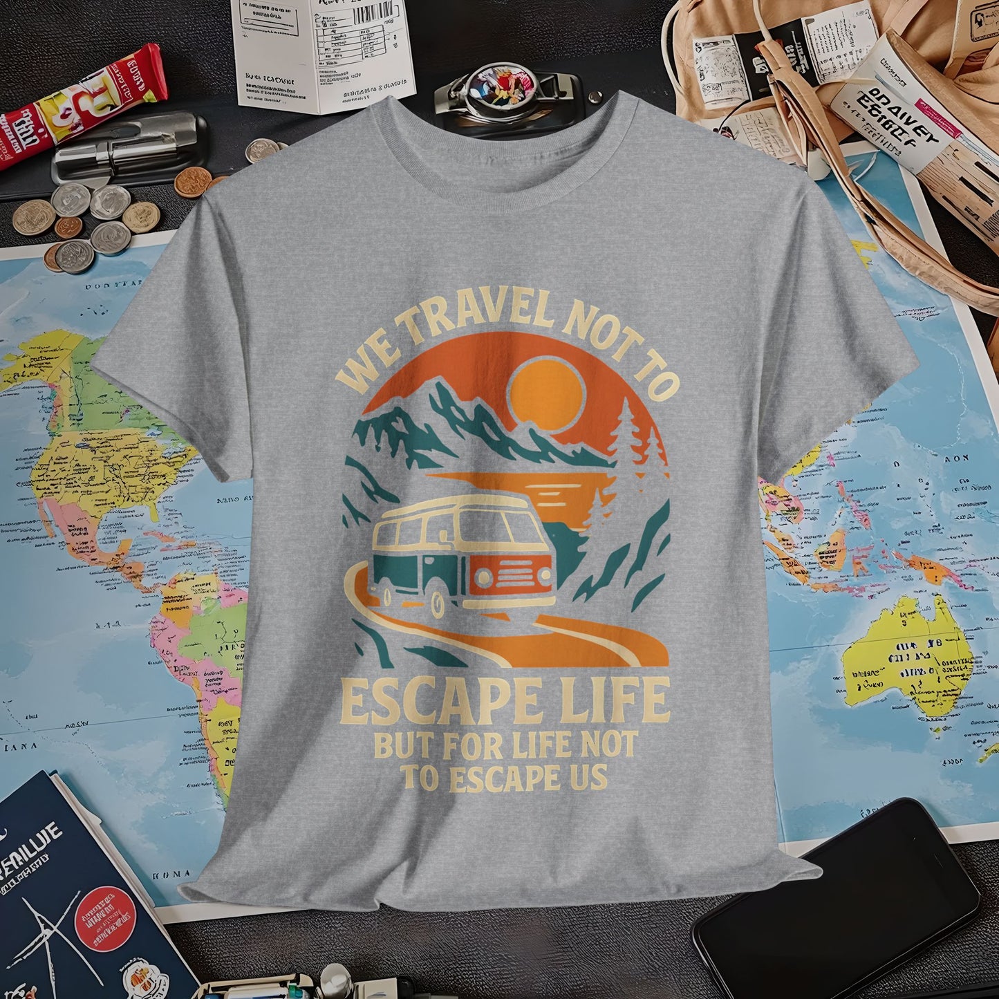 Travel Not to Escape Life – Retro Van & Sunset Road Adventure Tee | Layover Club Air Travel T-Shirts | Jetsetter, Airport, and International Flight Tees