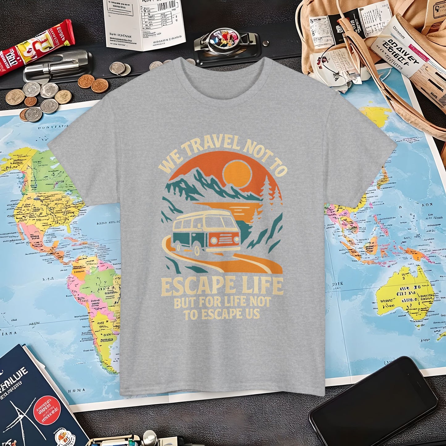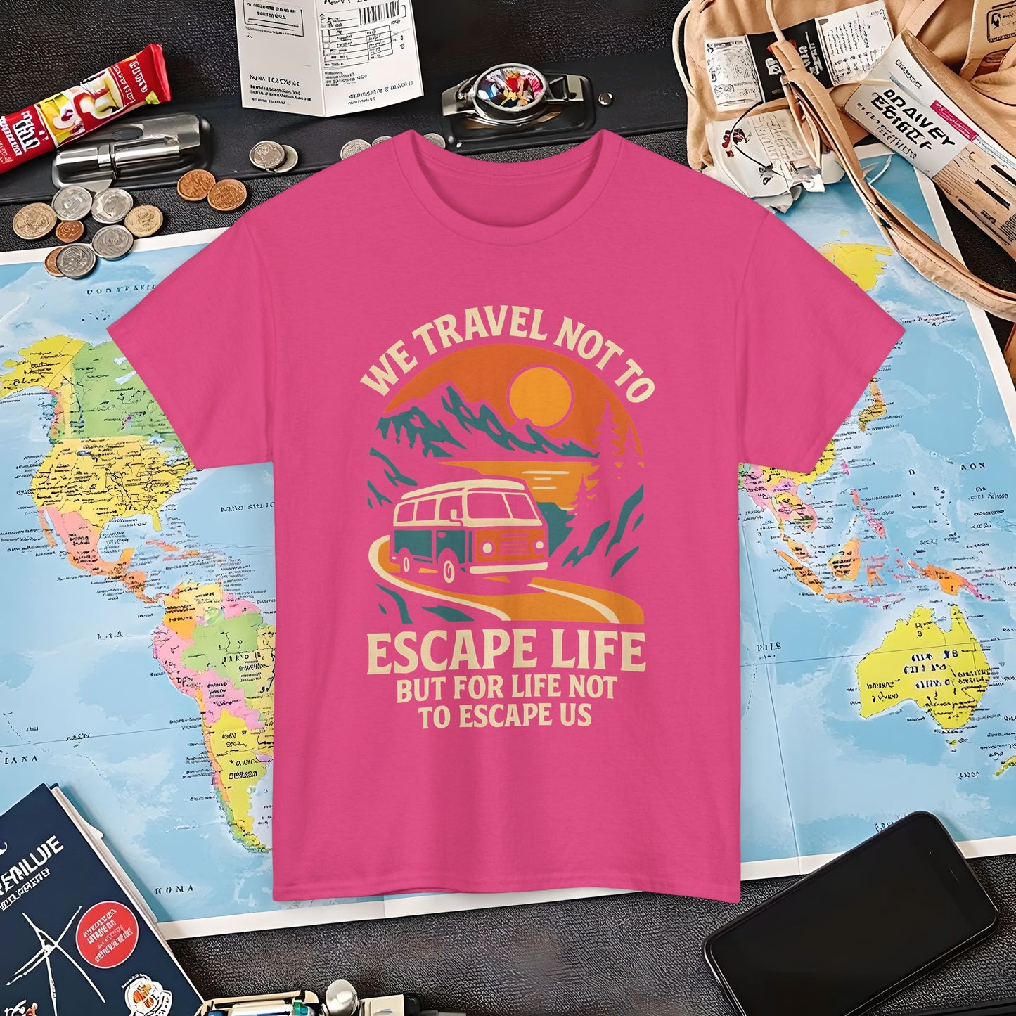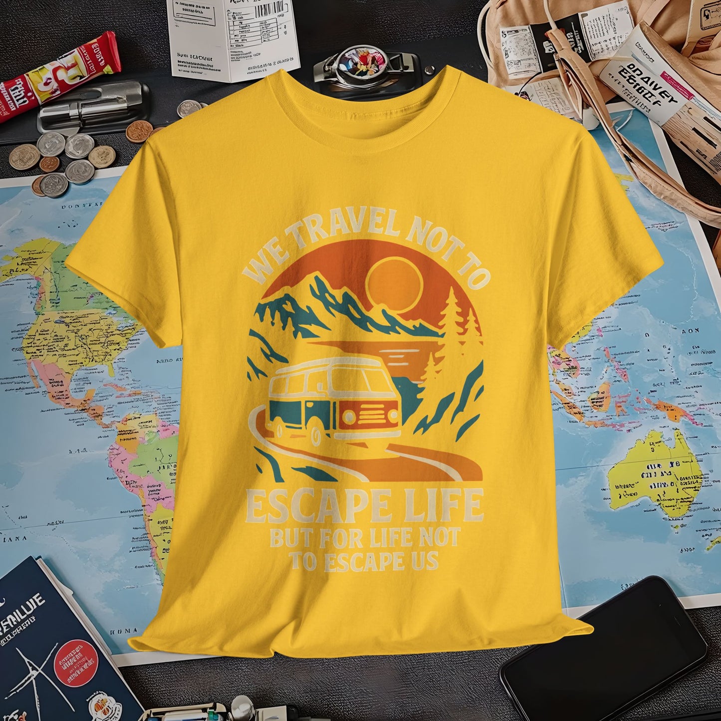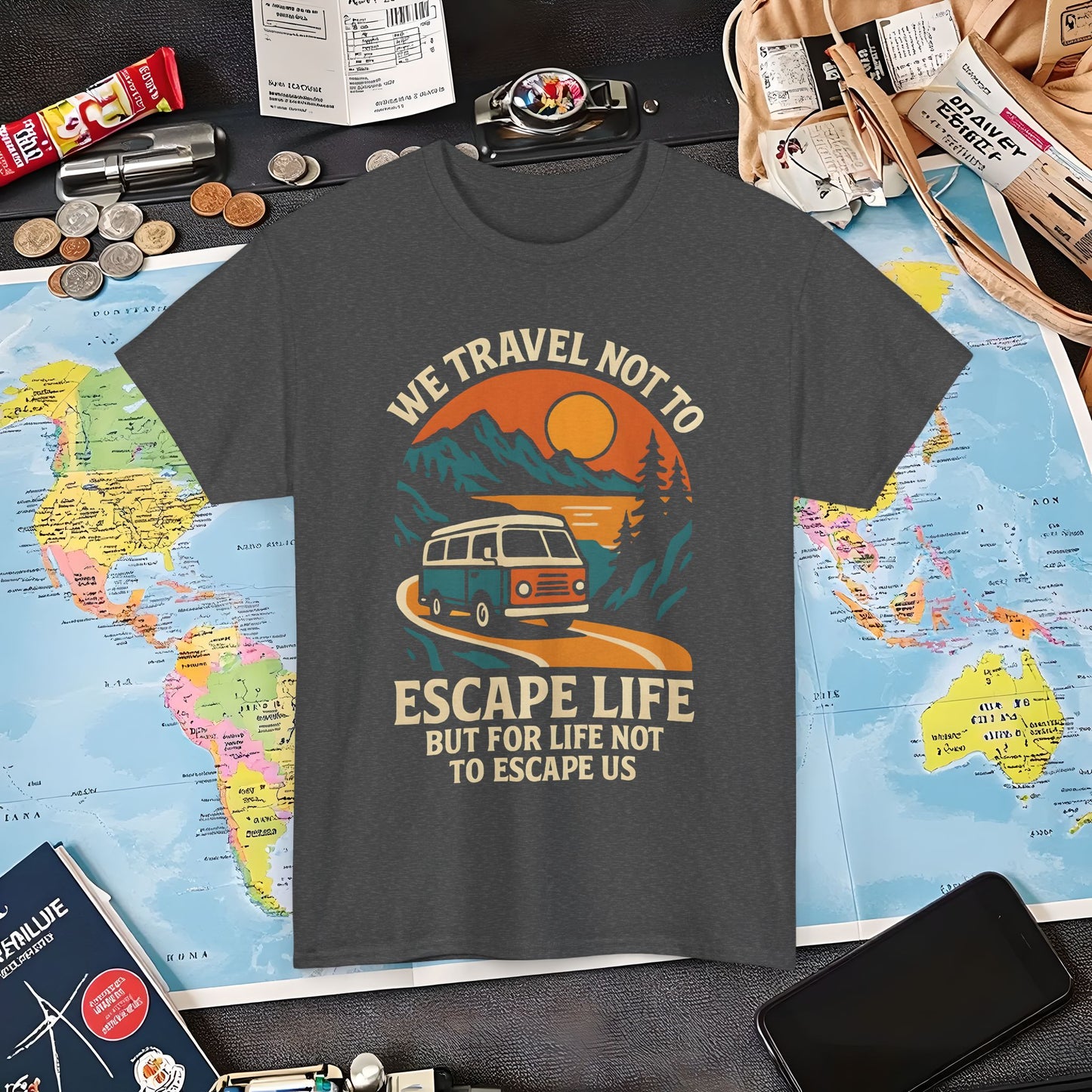 Travel Not to Escape Life – Retro Van & Sunset Road Adventure Tee | Layover Club Air Travel T-Shirts | Jetsetter, Airport, and International Flight Tees